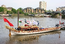 After three cold wet days for Gloriana’s launch, naming and the Jubilee Pageant, the sun shone on Gloriana for the summer. She was seen by thousands at St Katherine’s Dock; she was rowed by former Olympic medallists at the Henley Royal Regatta; she carried the Olympic flame down the Thames on the last day of the Torch Relay; she was on show at the Olympic Park for the Games and Paralympics; she preceded the competitors of the Great River Race and at the end of the year she transported the new Lord Mayor to his inauguration. Thus Gloriana has already settled into her legacy role as outlined in the official statement below.