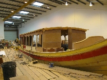 While the wooden structure of the boat was being built at Brentford, some amazing pieces of ornamental sculpture were being created by the hugely-talented David Crosswell of Polygon Scenery in his workshop. Made in modern materials, they look absolutely fabulous when gilded but the weight of the long pieces at the cockpit did cause some concern to the design team, requiring the batteries to be installed further forward so that level trim would be maintained.