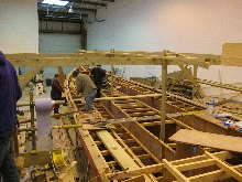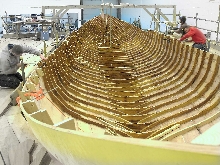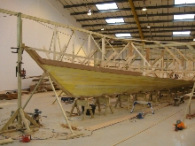 With a large, empty factory unit on an industrial estate at Brentford secured for 6 months, Mark’s team of shipwrights moved in with their tools in November and were joined by a number of others who had just finished working on the restoration of the Cutty Sark, plus some young people from the Prince’s Trust. Quality was monitored by our own surveyor, Ron Heasell. The boat-building work was done in two shifts from early morning until late at night, seven days a week, with Mark supervising them for almost all of the time. As the boat was considered to be too large to turn over, it was built upright. Using iroko hardwood, the shipwrights first laminated together the timbers for a continuous 80ft keel and stem, and set up the keel on stools to put it at the right height. Then temporary moulds (section templates) for planking the hull were set up, and checked carefully. The hull planking was done in high-quality khaya plywood with epoxy-resin adhesives starting from the keel upwards, using 10 planks each side, overlapped at the edges in clinker fashion.