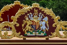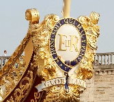 A week later much more ornamental gilded sculpture had been fitted, including regal crests above the companionways, 16 small shields showing a coat of arms of a Commonwealth country at the head of each cabin pillar, six flagpoles with dolphins at their bases (four more were added later) and two gorgeous golden lions which sit either side of the boarding deck gate. The artists had completed the painted ceiling panels of the birds of the Thames in the cabin and symbolic anchor murals on the back of the “coach”. A carpet with the Queen’s cipher set in a fretwork design had been woven by hand in Nepal and laid in the cabin. It was then time to invite HM the Queen to come and name Gloriana before Her Majesty attended the official opening of the newly-restored Cutty Sark at Greenwich.