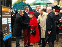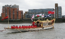 On a cold wet day with a vicious easterly wind blowing, Gloriana was towed down river to Greenland Pier to be named. The Queen’s Watermen came on board in their red dress-uniforms and the Royal Standard was hoisted. Her Majesty walked briskly down the jetty to the pier level where the design and build team were waiting. She was introduced by Lord Sterling to the leading shipwright Tyrone Marlow, myself and Ed. Then the Queen and Duke went aboard Gloriana and inspected the cabin and aft cockpit before coming back onto the pontoon to name the boat. The weather was so miserable that the Queen only stayed a few minutes but everyone’s mood was lifted enormously so that the visit was still being discussed an hour later as we all warmed up in the nearby floating pub. The Queen has sparkly eyes, smiles readily and when there is something to be done she doesn’t let horizontal rain and a gale put her off. After the Queen and Duke had left, Gloriana was rowed by the Queen’s Watermen down to Greenwich – this was the first time a Royal Barge had been rowed off Greenwich since 1849.