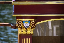 When the framework for the “coach” was in place Kate Woods joined the team in the New Year to advise on the interior design, fabrics and furnishings. Kate had been responsible for the decoration of Thames passenger boats from the Silver Fleet and brought many valuable ideas. In the spring the established company Hare & Humphreys was commissioned to add the artwork and finishing touches to the boat. These included the full external gilding process that took 1500 books of 23.5-carat gold leaf, internal painted panels based on the birds of the Thames, cockpit panels of an anchor design representing the Lord High Admiral and the long external wave pattern that runs along the sheer line (also known as ‘running dog’) as well as decorating the rudder and oars with sea serpents as seen on Prince Frederick’s barge.
